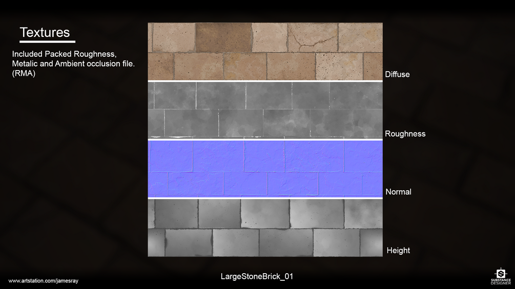 - Packed Roughness Metallic and Ambient occlusion (RMA)